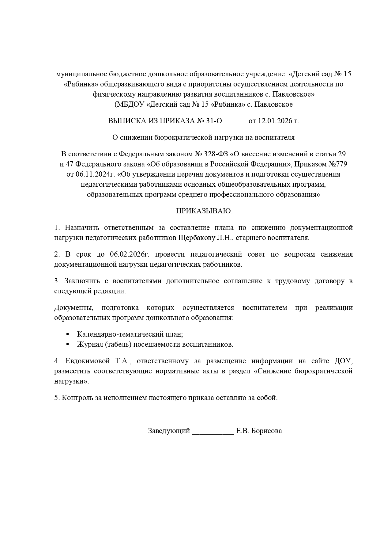по снижению документационной нагрузки педагогических работников МБДОУ «Детский сад №15 «Рябинка» с. Павловское»
